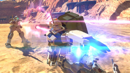 サーベルを両手に持って攻撃するため、攻撃回数が多く連続的にダメージを与えます。敵に反撃の隙を与えず連続で攻撃できますが、超接近用武器のためシールドガードをされると苦戦する場面も。「△」ボタンで敵機と一緒に空中へ飛び、空中で連続攻撃を繰り出します。