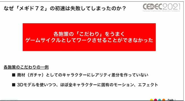 まず本作がなぜサービス開始の初速で失敗してしまったかを振り返りました。早川氏によれば「各施策のこだわりを、ゲームサイクルとして機能させることができなかった」ことが、失敗の原因なのだそうです。