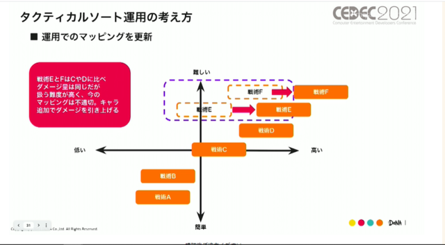 たとえば上の図では、戦術Eと戦術Cはほぼ同じダメージ量ですが、戦術Cのほうが使うのが簡単です。すると戦術Cの利用が集中してしまうため、不適切なマッピングの状態なのだと説明。キャラの追加や武器などでダメージを引き上げる施策をとるとのことです。