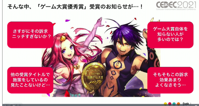 そんな中、ゲーム大賞受賞のお知らせが届きます。マーケティングとしては、「これをうまく施策に使えないか?」と考えたそうですが、当初は社内でも受賞に関して「ニッチすぎる訴求では?」とか「その賞自体を知らない人が多いのでは?」といった、消極的な声が出てきたそうです。