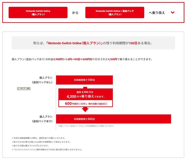 もし、現在「Nintendo Switch Online」に加入しており、追加パックへの乗り換えを希望している方は、1日でも早い乗り換えが金額面でお得。実は、残っている加入期間に応じて、乗り換える際に割引が適用されるのです。
