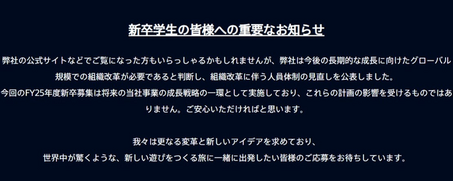 「新卒学生の皆様への重要なお知らせ」と題されたメッセージでは「弊社は今後の長期的な成長に向けたグローバル規模での組織改革が必要であると判断し、組織改革に伴う人員体制の見直しを公表しました。 今回のFY25年度新卒募集は将来の当社事業の成長戦略の一環として実施しており、これらの計画の影響を受けるものではありません。ご安心いただければと思います」と綴られています。