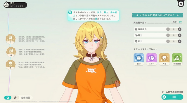 また、本作ではキャラクターにステータスポイントを割り振ることで選択できる選択肢に違いが出るほか、会話のなかでさらなるヒントを得られることもあります。ステータスに応じた選択肢が存在するかどうかを確認できる機能もあり、ステータスは後ほど変更可能でした。