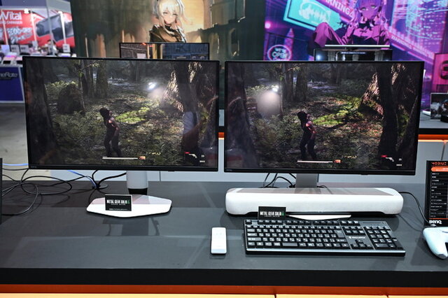 第4世代QD-OLED:QD採用の最新26.5インチモニターMOBIUZ「EX271UZ」も展示。こちらは両モニターとも同じ『METAL GEAR SOLID Δ: SNAKE EATER』のゲームプレイが映し出されており、左の「EX271UZ」がSRGBモードでの表示、右の「EX271UZ」がリアリスティックモードでの表示となっていて、その違いが一目でわかるようになっています。
