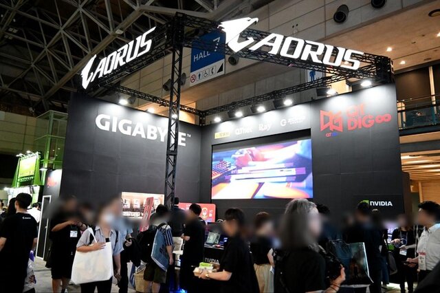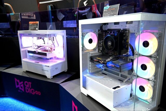 AORUS/QT DIG (GIGABYTE)では『Stellar Blade』を試遊出展。「GeForce RTX 50シリーズ」が搭載されたゲーミングノートPCや鮮やかなホワイトのPCケースが印象的なゲーミングデスクトップPCが並んでいました。