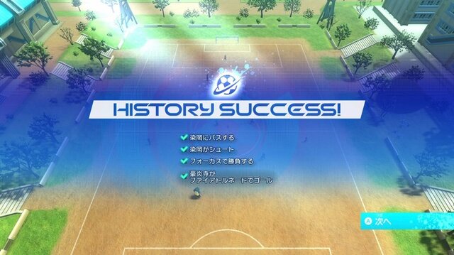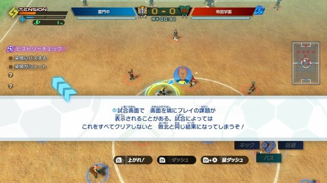 試合にはそれぞれ達成するべきサブ目標、ヒストリーチェックが設定されており、これを試合内で達成できないと敗北扱いになってしまいます。今回の試合ではフォワードの染岡にパスを渡し、シュートを打たせる必要があります。