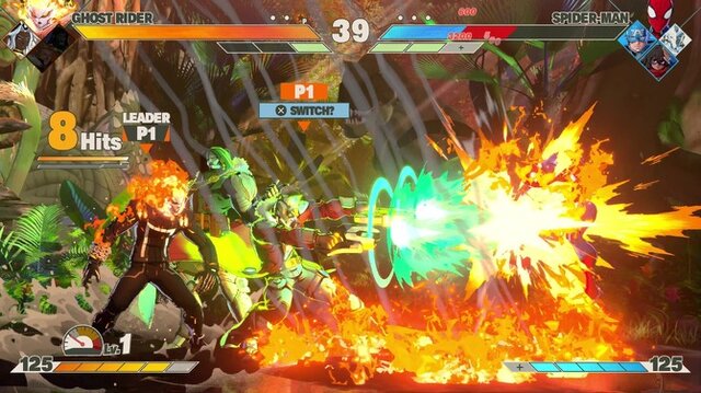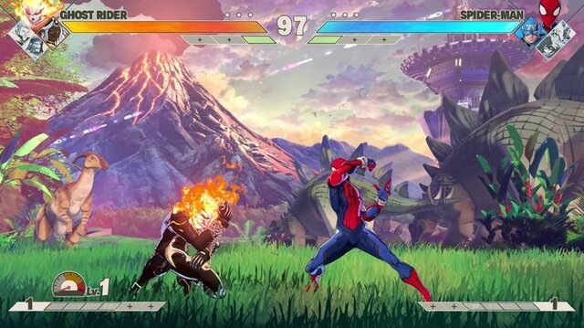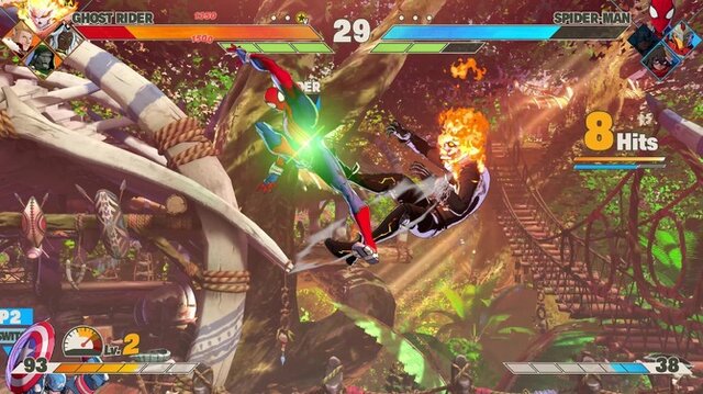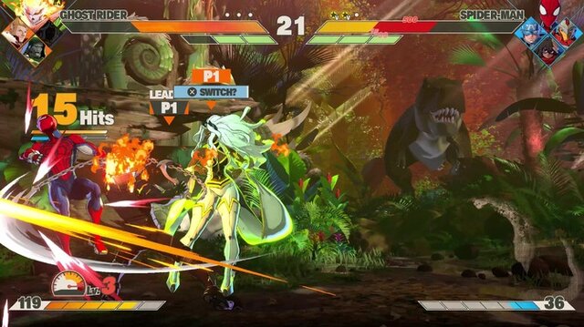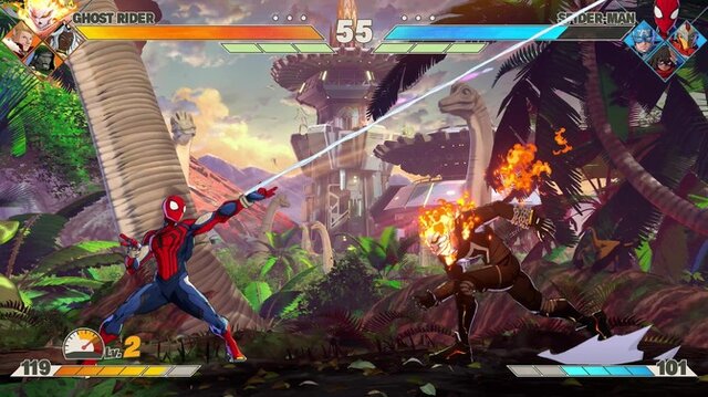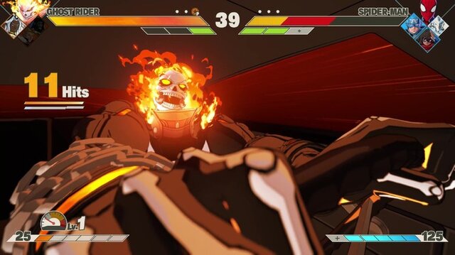 今回の試遊では、TGSで初公開となるスパイダーマンとゴーストライダーを中心にプレイしました。スパイダーマンはウェブ・シューターによるけん制や、ウェブ・スイングでの変幻自在な動きが強力。格闘ゲームでウェブ・スイングを体験できるとは思いませんでした。一方のゴーストライダーは、炎をまとった鎖によるリーチの長い攻撃が特徴的です。
