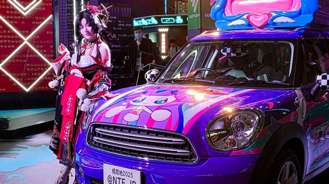 本ブースは主に「舞台ブース」と「試遊ブース」に分かれ、舞台ブースは『NTE』の舞台となる都市「ヘテロシティ」の世界観をイメージしたデザインに。ブース正面で目を惹く展示車両は、実際にゲーム内に登場する車両をイメージしたハイパーな痛車仕様。なお、こちらはオブジェではなく実車を改造したもので、展示中は実際に乗ることができます。
