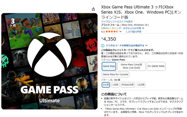 公式の月額料金が上がった一方で、Amazonではまだ「Xbox Game Pass Ultimate 3か月オンラインコード版」が4,350円、「PC Game Pass 3か月オンラインコード版」が2,970円で、記事執筆時点では販売されています。