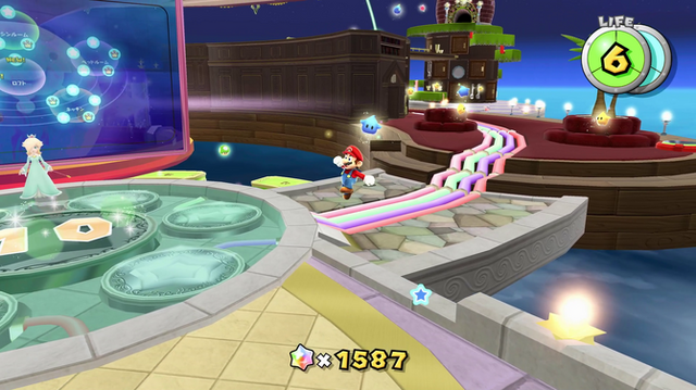 ステージ選択も、『スーパーマリオ64』の箱庭型をコンパクトにしたような構成で、ロゼッタの持つ星船の各所にある「ドーム」から周囲の「ギャラクシー」を観測し、飛んでいくというものになっています。上述のとおり、ストーリーが進むとロゼッタがチコに絵本を読み聞かせをするような場面もあり、幻想的な雰囲気と熱いシーンが同居する作品となっていました。