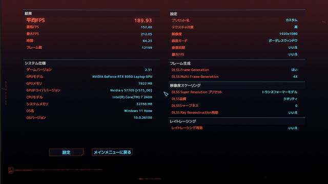 ちなみにベンチマークを起動してからプレイしたところ、テクスチャ設定は「高」となりました。上図のスクリーンショットではオフにしていますが、追加でレイトレーシングを「低」設定にしてもプレイは安定。DLSS機能もサポートしているので、フレームレートに関しても心配することはほとんどありません。
