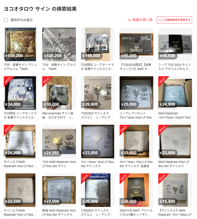 昨今、中古市場では、クリエイターがサインを入れたアイテムが高額転売されている状況が続いています。実際に、フリマアプリの「メルカリ」で検索してみるとヨコオタロウ氏のサイン入り商品が高額出品されているのが確認できます。