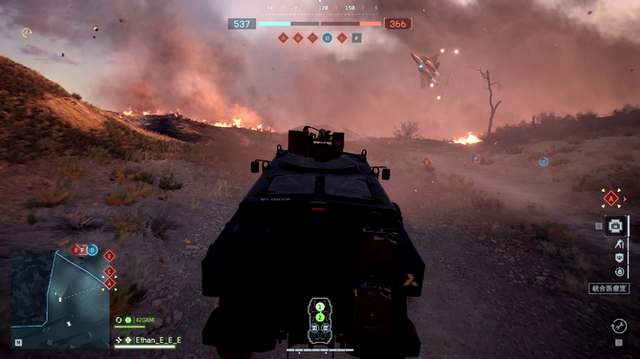 大規模戦では4人乗りの装甲車両「トラヴァーサー マーク2」が強力です。運転席以外の3席にレートと威力が高いマシンガンが設置されており、カスタム次第では近隣の味方を回復する機能も持ち、戦車の砲撃にも2発耐える耐久力と走破力も兼ね備えているので、意外なしぶとさを見せてくれる「戦う救急車」とでも言うべき存在です。ただし製品版では地雷に苦しめられる未来も見えます。