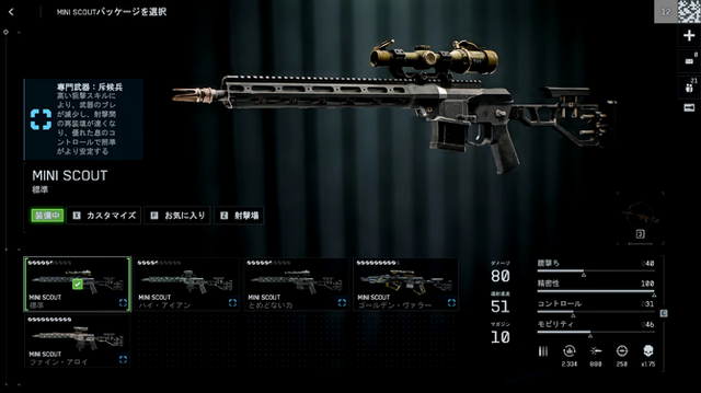 新スナイパーライフル「MINI SCOUT」はダメージは80で、レートがスナイパー最速の51、胴体2発キルや腰撃ち精度特化で突撃スナイパーのような運用もできます。 もちろんスナイパーライフルなのでヘッドショットなら1発でキルできます。 スナイパーライフルでありながらDMRのような感覚でも使える楽しい武器です。