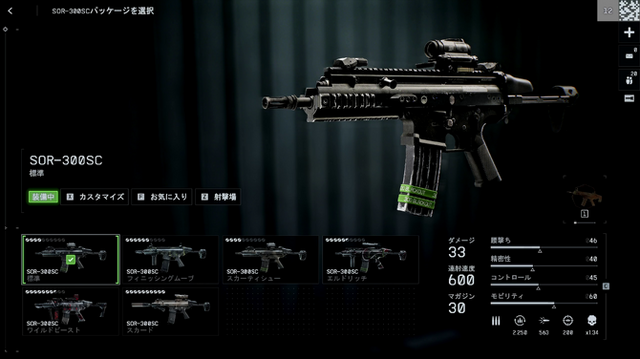 新カービン「SOR-300SC」はダメージ33、レート600の高威力低レート型です。デフォルトでは横ブレが激しいものの、構成次第で制御しやすくなりヘッドショットを狙えます。高レート武器との近距離戦は苦手ですが、適切な距離なら1マガジンで複数キルも狙えます。