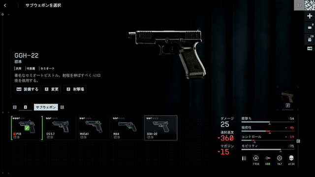 新ピストル「GGH-22」はダメージ25、レート360と標準的な性能ですが、装弾数が15発と多く、中距離でも当てやすい印象でした。