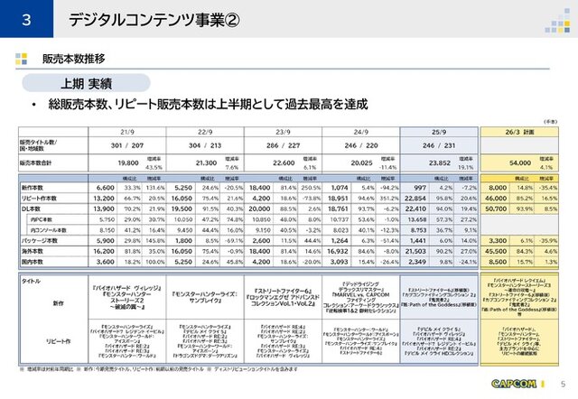 同期の販売本数上位タイトルを見ると、2025年にNetflix版アニメが公開された『デビル メイ クライ』シリーズの『デビル メイ クライ5』は第1四半期から引き続きトップとなっており、『バイオハザード レクイエム』の2026年発売を控える『バイオハザード』シリーズの複数タイトルの販売本数も伸び、ニンテンドースイッチ2版が発売された『ストリートファイター6』も同じく続いてトップ10入りする結果となりました。