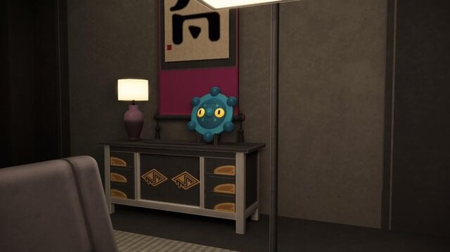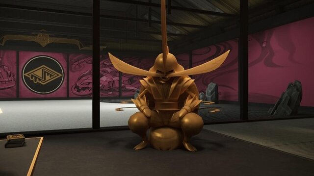 先ほどはポスター、いわば一枚絵でカメオ出演しているパターンを紹介しましたが、本作には立体物として登場しているポケモンも。特にストーリーを進めると訪れるヤが付きそうな団体「サビ組」の事務所では、入り口で既に本作未登場の「ドドゲザン」と「マタドガス」の像が飾られています。
