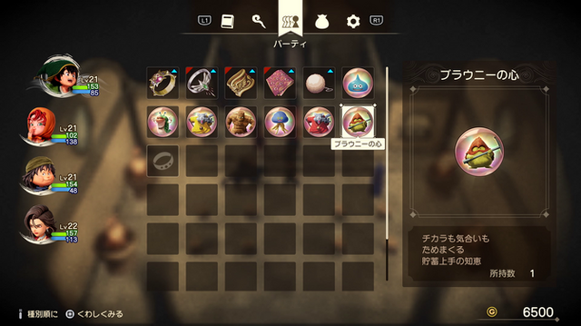 さて、戦闘に入る前にそうびをチェックします。このビルドではモンスターのこころをいくつか入手していました。