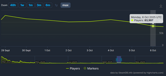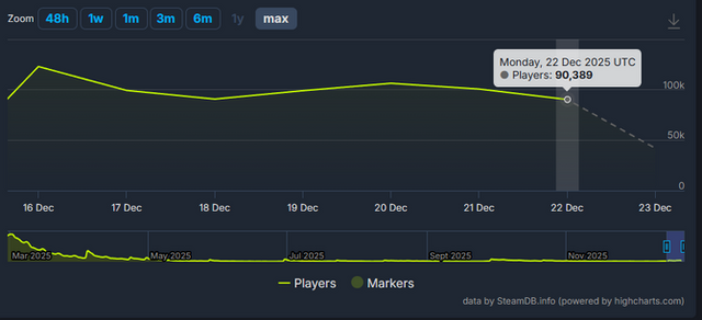 一方、非公式統計サイトSteamDBで同時接続プレイヤー数を見ると、アップデート第4弾配信当日のピークが123,046人となっており、最新のデータである22日でも90,389人です(時差のためか、日本からアクセスしたSteam公式サイトでは執筆時点の2025年12月23日で90,389人と掲載)。