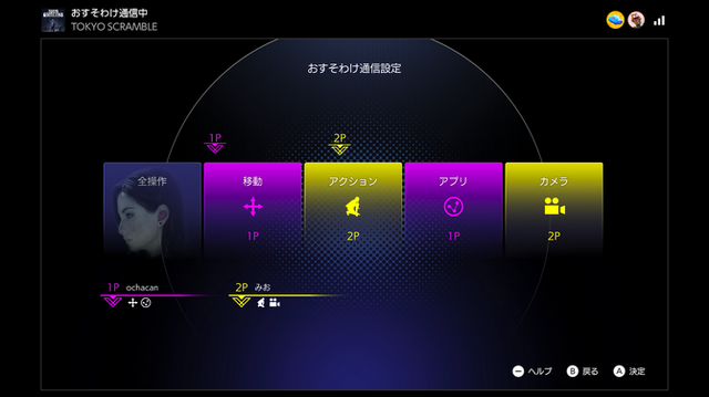 たとえば、プレイヤー1は「移動」を、プレイヤー2は「アクション」を、プレイヤー3は「カメラ」を、プレイヤー4は「アプリ」を、というようにそれぞれ役割を選択してアンを操作します。今回は2人プレイにて、「カメラ」と「アクション」を筆者に、「移動」と「アプリ」を友人に割り振って遊びました。
