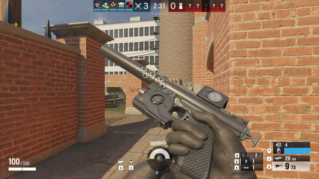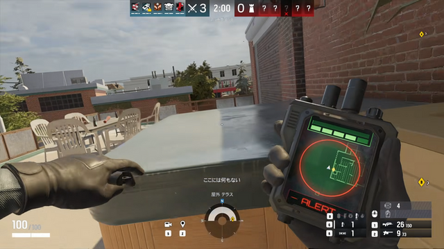 攻撃側オペレーターの「ソリッド・スネーク」が持つ固有ガジェットは、『メタルギアソリッド』シリーズお馴染みの「ソリトンレーダー」。構えることで周囲のレーダーが表示され、その範囲内に脅威(敵)がいるとアラート状態となり、精密モード(PC版ではF長押し)をすることで敵の位置と向いている方向が数秒わかるという代物です。サブガジェットはスタングレネードに加え、グレネードやインパクトEMP、ブリーチングチャージなど、複数から選択することが可能です。