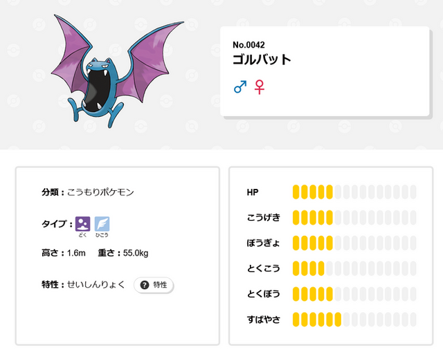 ゴルバットは「ズバット」→「ゴルバット」→「クロバット」という進化過程のポケモンで、ゴルバットの「なつき度」が高い状態でレベルアップを迎えると「クロバット」へと進化します。クロバットは第二世代『ポケットモンスター 金・銀』で追加されました。