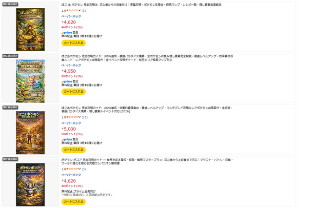 価格帯も4,600円代~5,000円と、攻略本の相場(一般的に1,500~3,000円ほど)とはかけ離れています。ユーザーレビューでは中身を確認した方もおり、構成が「AIに頼んだときの見た目」との評価。記事執筆時点ではISBNコードを検索してもヒットせず、“偽攻略本”であることが明白ですので、お子様をお持ちの方などは誤って購入してしまわないようご注意ください。