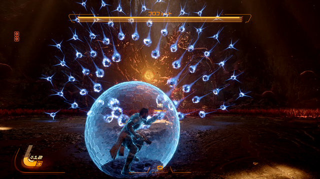 システム面でも、『Returnal』から大きく変化した要素があります。それが「シールド」です。本作ではR1ボタンを長押しすることでシールドを展開でき、敵の弾幕の一部を吸収することが可能です。吸収したエネルギーは、L2+R2で発動する特殊攻撃として放出でき、高威力の攻撃を繰り出せます。「回避でやり過ごすか、シールドで吸収するか」という選択肢が常に突きつけられるため、戦闘にはより高い戦略性が求められます。