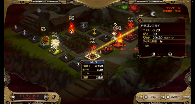 マップは通常の表示のほかに、クリーチャーモードがあり、一目で属性やステータスを分かりやすく表示することもできます。土地が連鎖した時や、あるいは奪われて連鎖が少なくなった時には、土地の価値がどう変化したのか倍率が表示されます。土地をレベルアップすると、土地がせりあがって、ビジュアルで高レベルの土地が分かりやすくなりました。
