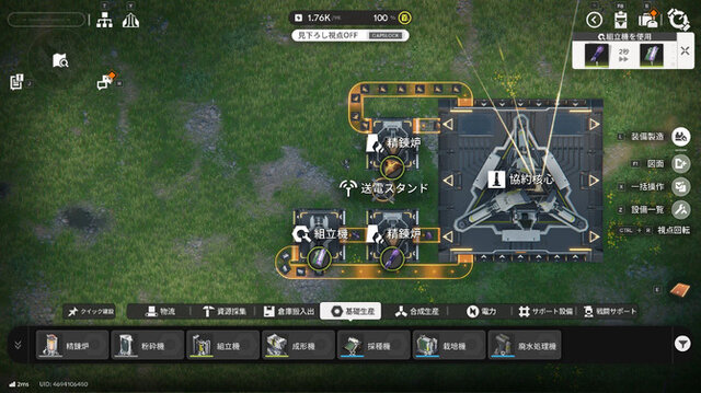 まずは精錬炉を設置してみましょう。協約核心とは工業エリアの中心となる生産拠点で、ここから素材が取り出されて各機械に供給されます。協約核心の取り出し口に合うように起きたいところですが、カメラ視点だと置きにくいのではないでしょうか。