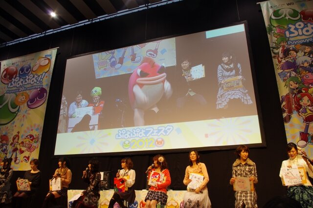 『ぷよぷよ!!』の声優陣たちが、魚に足が生えたキャラクター“すけとうだら”の似顔絵を「ぷよぷよフェスタ2012」ステージにて披露しました。