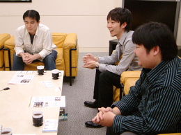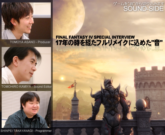 いよいよ本日12月20日に発売になるニンテンドーDS用ソフト『ファイナルファンタジーIV』は、一般から主題歌「月の明り-ファイナルファンタジーIV愛のテーマ-」のボーカリストを募集するなど、サウンドにこだわった作品です。 イベントシーンでは豪華声優陣を起用し、ボイスでストーリーが語られます。実は本作にもCRI・ミドルウェアの「救声主」が採用されています。今回はCRIの技術スタッフと共に株式会社スクウェア・エニックスにお邪魔し、プロデューサーの浅野智也氏、SEディレクターの神谷智洋氏、そして開発を担当した株式会社マトリックスのメインプログラマーである高柳新平氏にお話を伺ってきました。 ―――まずはそれぞれの今作での役割から聞かせてください 浅野: プロデューサーの浅野です。企画の立案から、方向性決め、全体的な取りまとめ、進捗管理、あらゆることに首を突っ込んできました。この前には同じくプロデューサーという形でDSの『ファイナルファンタジーIII』に関わりました。当初は『III』と同じように『IV』を作ろうと考えていたのですが、イベントを強化しようということで、ボイスを乗せる事になりました。ロムの容量はギリギリだったので、マトリックスの高柳さんにも無理を言って、何とか最小限で出来る方策は無いかと巡らせていたら、たまたまCRIさんが弊社の会議室でミドルウェアのプレゼンをされていて、"渡りに船"で飛びつきました。神谷: サウンド室の神谷と申します。本作では効果音とダイアログを担当しました。本当はもっと手を動かしたかったのですが、SEディレクターという立場で効果音スタッフをまとめながらディレクションに重きを置いて作業を進めました。前回の『III』から、引き続き担当しました。 高柳: マトリックスの高柳と申します。メインプログラマーとして全体的なプログラムのディレクションをやってきました。「救声主」の方もCRIさんとやりとりさせていただきました。 ―――ということは『III』のメンバーが引き続きという形ですね 浅野: そうですね。あとは『III』でいうと田中弘道さん、『IV』でいうと時田貴司さんというオリジナルメンバーを中心に固めていきました。 ―――最初のお話にもありましたが、「イベントシーンを強化しよう、注力しよう」という事になった経緯を聞かせてください 浅野: まず『III』から引き続いてフルリメイクシリーズのコンセプトは踏襲していて、(1)グラフィックの刷新 (2)シナリオの掘り下げ (3)リバランス、この3点は『IV』でも変わりません。このうち一番注力すべきところは『IV』といったらどこだろうと考えました。そしてユーザーさんが一番期待しているところ、オリジナル版を遊んだ人が一番覚えているのはイベントでありシナリオだろうということで、開発のコンセプトとしてイベントには力を入れていこうという事が最初に決まりました。社内のコンテチームにコンテを新しく描き下ろしてもらって、ボイスを入れて、それをマトリックスさんに実装してもらったのですが、これがなかなか大変で・・・。 高柳: そうですね、やはり性能が上がったとはいえ携帯ゲーム機ですから、DSハードでポリゴン劇をするとなると色々制限もありまして、個別のイベント毎に工夫に工夫を重ねて、なんとか実装していきました。コンテを見ても、これはホントにできるんだろうかと・・・と思う部分はありましたけどね(笑)。まあプログラマ魂は掻き立てられましたね。 浅野: 最初、コンテチームからコンテが上がってきた時にも「これはDSで大丈夫かな」というようなのはあったところに、更にボイスを乗せたので・・・(笑)。もともとコンテチームには"DSだからこれくらい"というような事は余り考えないで良い物を上げてもらうようにお願いしていて、最終的にはマトリックスさんの方で可能な範囲で良いように料理してくれるだろう、と思っていたのですが、かなり無理をしていただいたようでちゃんとコンテを再現することができました。キャラの表示順が変わると止まってしまうというくらい、ギリギリのメモリチューニングでやっていたりします。